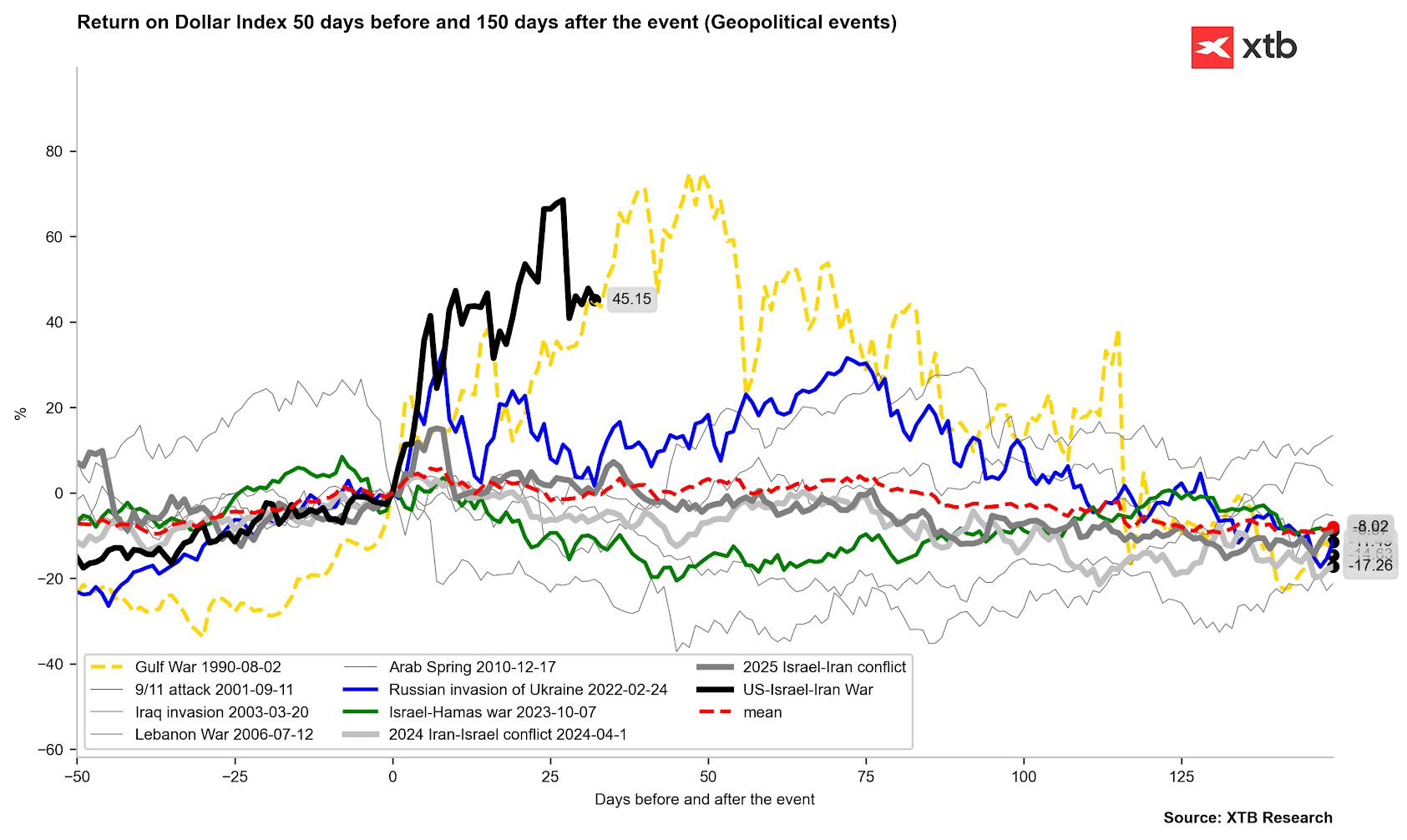 Seguimos observando un short‑covering agresivo entre los inversores no comerciales. El volumen de posiciones cortas ha caído a niveles mínimos de principios de 2026. Por el contrario, las posiciones largas han igualado su pico de principios de 2026. El posicionamiento neto sigue siendo inferior al de 2024 y 2022, cuando los precios cotizaban cerca de 150 centavos en medio de altos precios del petróleo. Por ahora, estamos viendo expectativas de deterioro de los fundamentales más que un cambio real. Una reducción de posiciones largas podría señalar una reversión, aunque los niveles de precios siguen siendo relativamente bajos. Fuente: Bloomberg Finance LP, XTB
