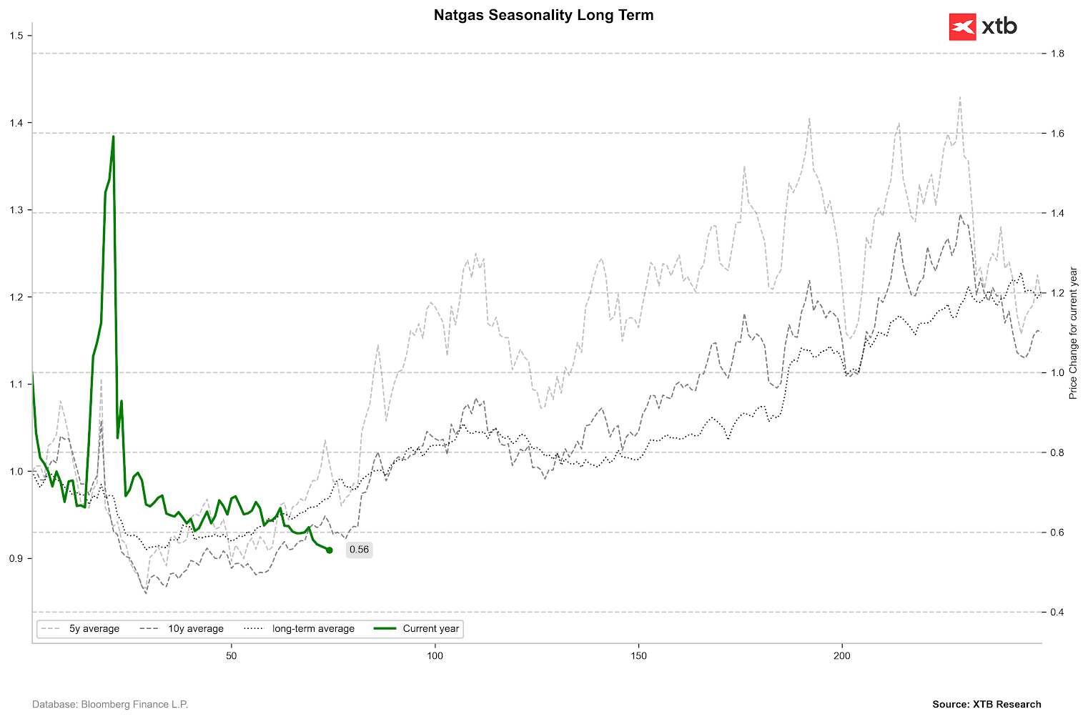 Los precios han subido considerablemente desde principios de febrero, aunque siguen muy por debajo de los picos de 2022 o 2024. La estacionalidad sugiere que, en unas semanas, los precios podrían volver a niveles más bajos. Fuente: xStation5