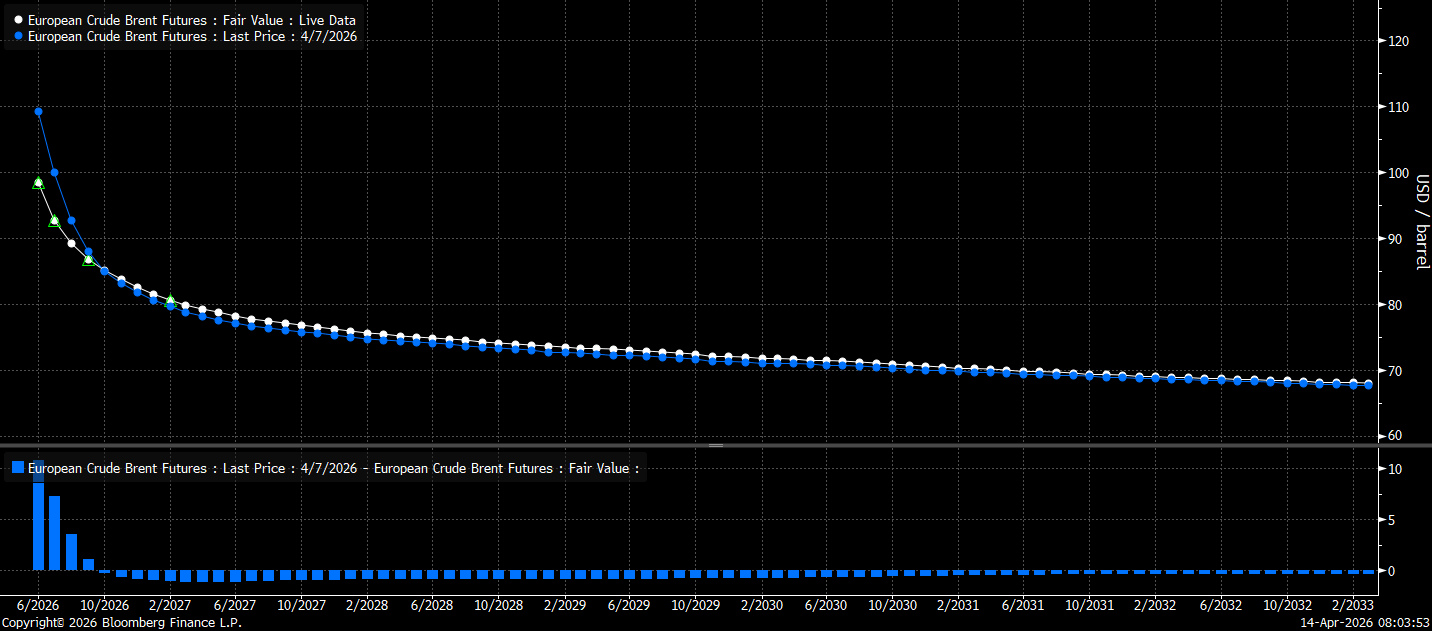 Cabe señalar que el mercado de futuros estaba significativamente más ajustado hace una semana, justo antes de la fecha límite del acuerdo de alto el fuego. Por el contrario, el mercado físico continúa mostrando una tensión extrema. El Dated Brent cotiza actualmente cerca de 130 dólares por barril. Fuente: Bloomberg Finance LP