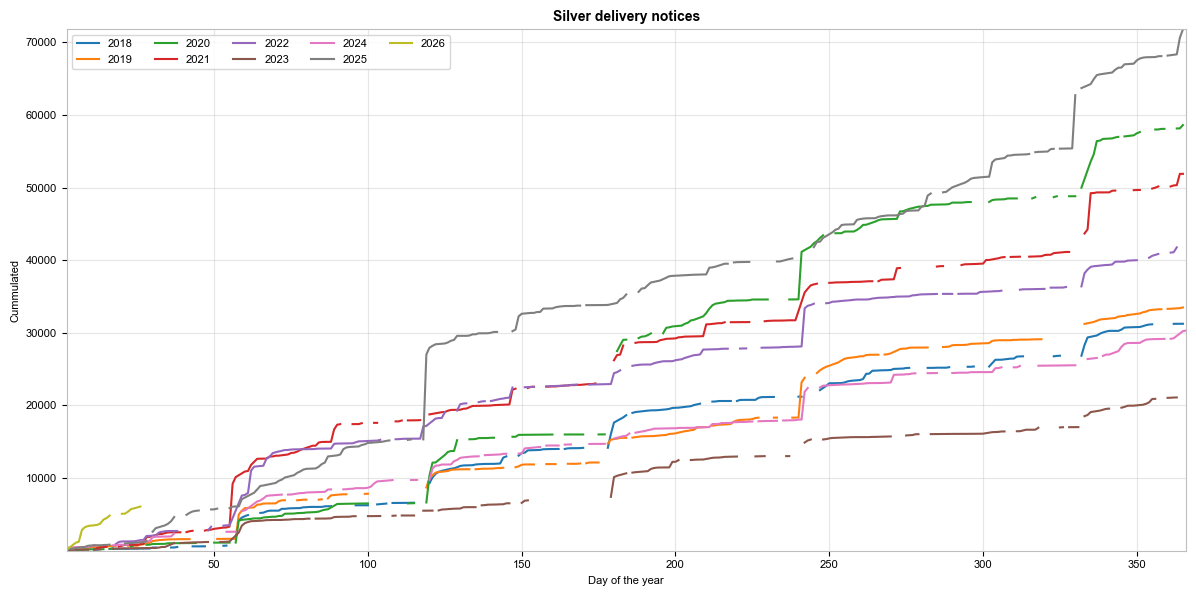 El interés abierto del contrato de marzo ha comenzado a repuntar, lo que podría indicar una mayor disposición a solicitar entrega física. No obstante, el factor determinante será cuántos contratos se renuevan durante la primera mitad de febrero. Si el número de contratos se mantiene en el rango de 80.000 a 100.000, podría plantear un posible problema en cuanto a la disponibilidad de plata en la bolsa. Aun así, conviene destacar que el volumen actual de posiciones abiertas en el contrato de marzo no es extraordinario.