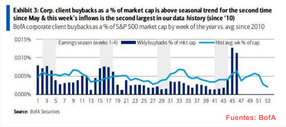 Como se puede observar en la imagen de Bank of America, las recompras se aceleraron en las últimas dos semanas, alcanzando niveles históricamente altos.