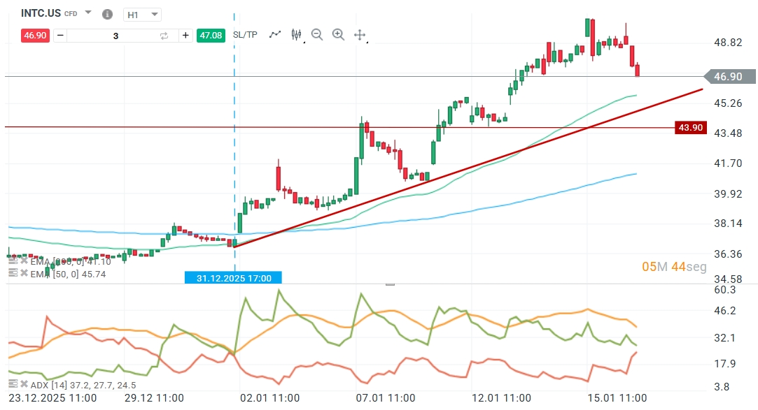 El anuncio de los nodos 18A y 14A, sumado a la escasez reportada de CPUs para servidores, ha proporcionado optimismo para la empresa Intel Corp. Desde el 31 de diciembre de 2025, el precio ha mantenido una separación constante respecto a su EMA de 50 periodos (verde), consolidando un cambio en la dinámica de corto plazo.