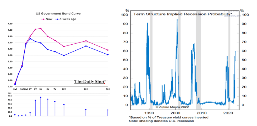 Y esto como vemos repercute en la gráfica de la derecha en un mayor riesgo de recesión basado en el nivel de inversión de las curvas del tesoro americano, que empieza a ser tan probable como las últimas crisis económicas acontecidas.