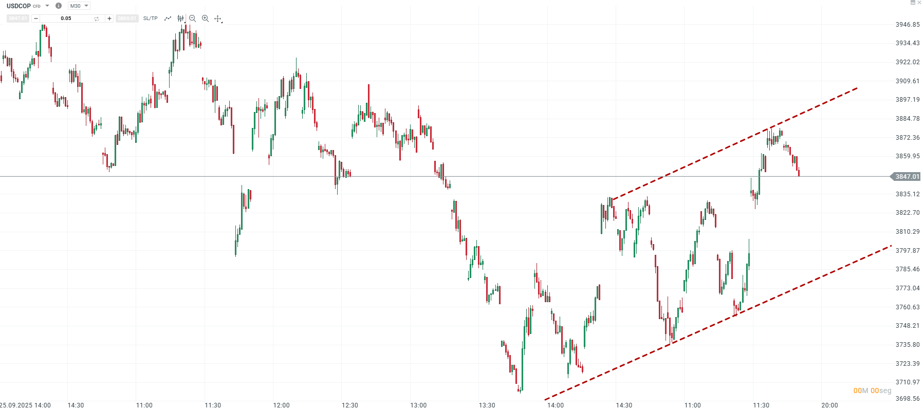 En el mercado cambiario, el peso colombiano ha mostrado recientemente un movimiento de recuperación frente al dólar, pero con volatilidad. En un gráfico de USDCOP de corto plazo se observa: