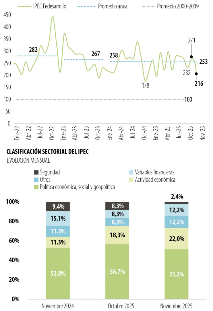El Ipec en Colombia, elaborado por Fedesarrollo, se ubicó en 216 puntos, lo que supone una caída de 55 puntos frente a octubre de 2025 (271) y de tres puntos respecto a noviembre de 2024 (219).