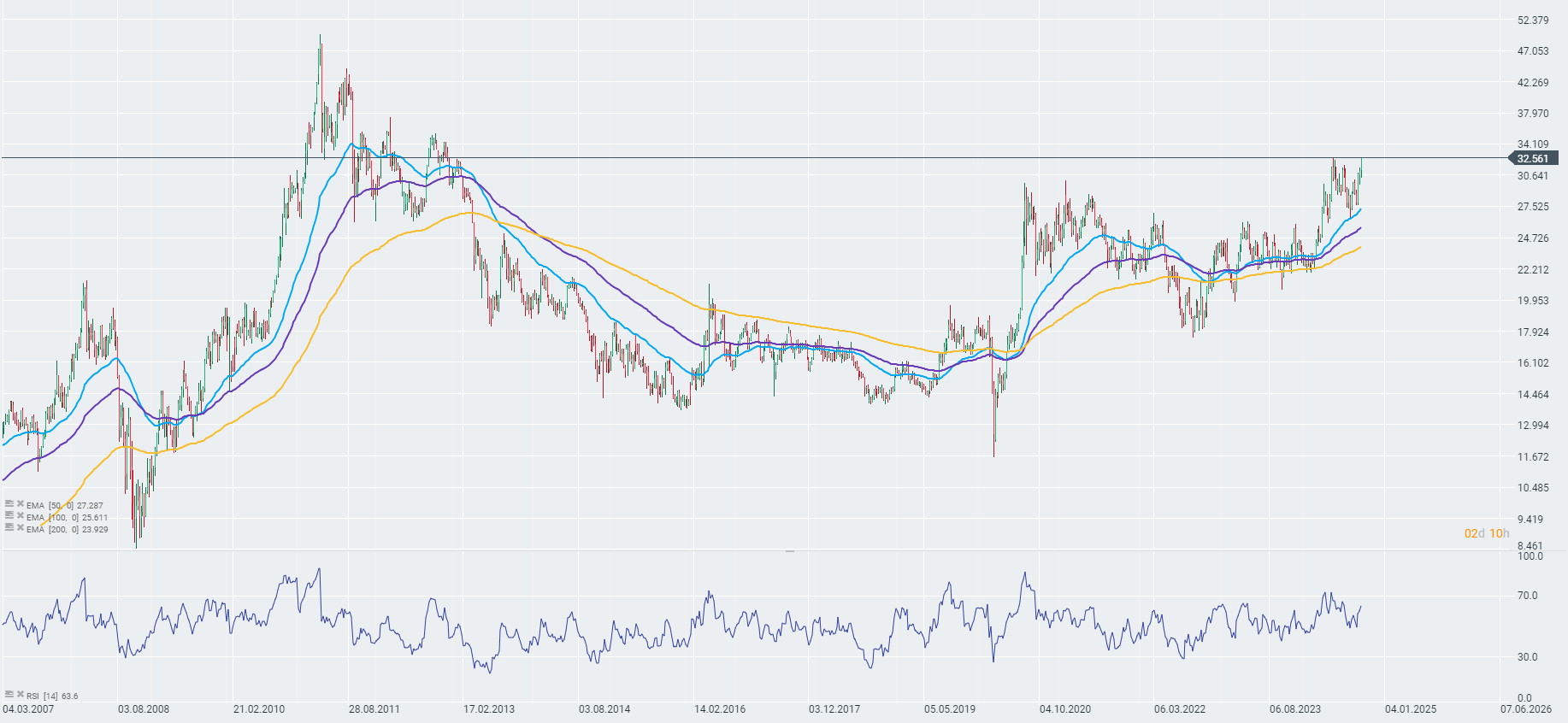 Los metales preciosos continúan su racha alcista, alcanzando nuevos máximos. En el caso del oro, hoy observamos subidas superiores al 0,8%, que con su rango impulsaron al lingote por encima de los 2.675 dólares la onza. En el caso de la plata, la subida es aún mayor, ya que alcanza el 2,2%. Así, la plata supera los 32,5 dólares y cotiza en sus niveles más altos desde 2012.