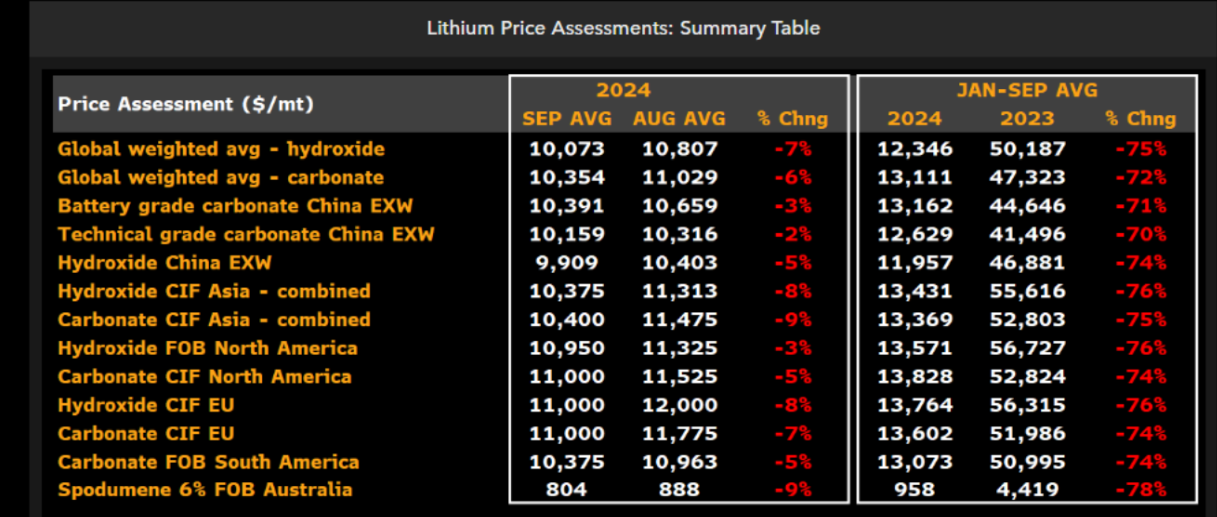 Los precios del litio continúan su tendencia a la baja, tanto mensual como anual. Fuente: Bloomberg Finance L.P.