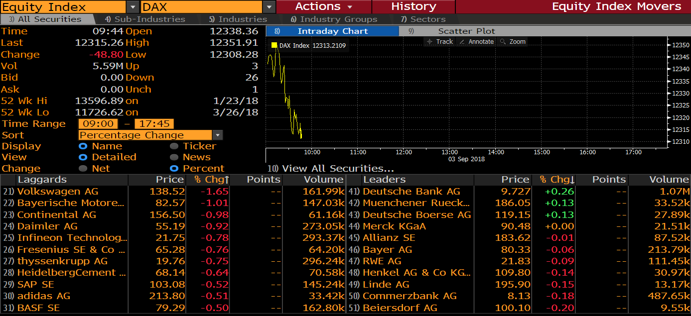 Estas bajadas de los fabricantes de automóviles alemanes se debe principalmente a los últimos comentarios del negociador del Brexit de la Unión Europea, Michel Barnier. Advirtió que los fabricantes de automóviles con sede en Europa podrían tener que usar menos piezas fabricadas en Gran Bretaña después del Brexit. Hay que tener en cuenta que alrededor de 186k personas están empleadas por la industria del automóvil en el Reino Unido. Por otro lado, comentar que el PMI manufacturero del Reino Unido cayó a 52.8 desde 53.8 (revisado por debajo de 54) en agosto.