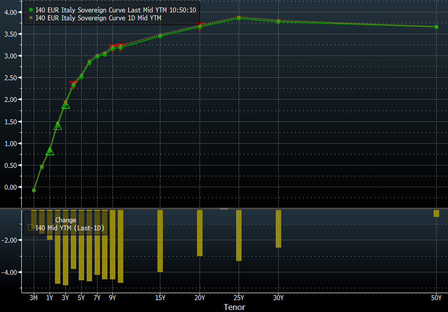 Los rendimientos de los bonos italianos se están moviendo hacia la baja esta mañana, sin embargo, los diferenciales siguen siendo elevados de todos modos. Las próximas semanas serán críticas para los activos italianos hasta que se conozcan los detalles de los presupuestos. Fuente: Bloomberg