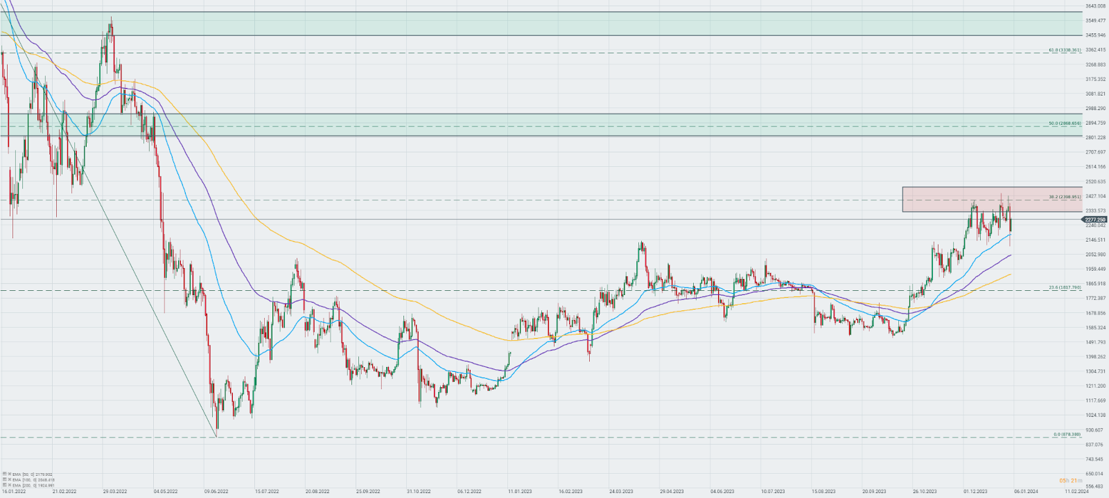 Ethereum también está recuperando algo de terreno después de la dinámica liquidación de ayer. En términos de geometría del mercado local, la EMA de 50 días (curva azul) y la zona de 2.400 dólares, donde discurre el retroceso de Fibonacci del 38,2% de la onda bajista iniciada en noviembre de 2021, ahora pueden ser niveles de control importantes. Fuente: xStation