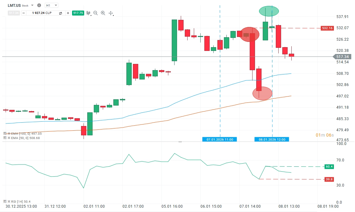 Tras las declaraciones del miércoles sobre la posibilidad de bloquear dividendos y recompras para contratistas de defensa, el gráfico refleja un ajuste inmediato en LMT.US, alrededor de las 16:00 (GMT-3) se observa una caída abrupta que llevó al precio a marcar un retroceso máximo cercano a -6,84% (considerando mechas, no solo cuerpos). Aun con esa presión vendedora, el RSI (14) no llegó a condiciones de sobreventa, el mínimo intradía de este rondó los 39,8, lo que sugiere un descenso fuerte, pero más asociado al riesgo de titular político que a capitulación técnica.