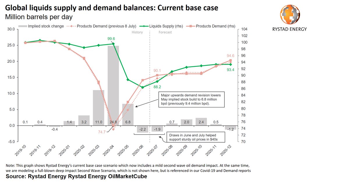Las últimas previsiones muestran un exceso de oferta de más de 2 millones de barriles por día en Otoño. Fuente:Rystad Energy