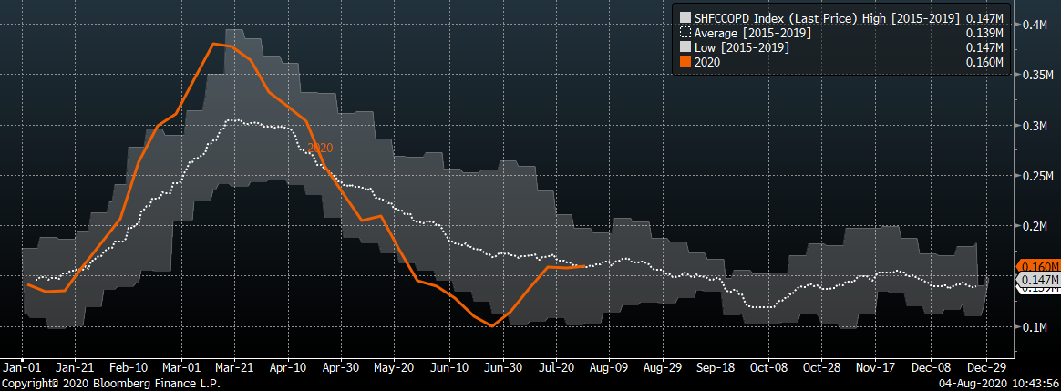- Hay muchas preocupaciones sobre una mayor recuperación de la demanda de los niveles actuales, Marathon Petroleum informa de una disminución en la demanda de gasolina en el suroeste (un área de demanda clave) a medida que aumentan los casos de coronavirus. Al mismo tiempo, la compañía mostró resultados bastante pobres para el segundo trimestre del año.