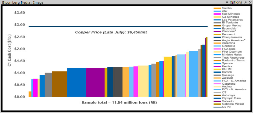 Actualmente, toda la producción de Cobre es rentable en términos de costes operativos a nivel mundial, lo que significa que hay pocas posibilidades de introducir recortes de producción en el futuro cercano. Fuente: Bloomberg