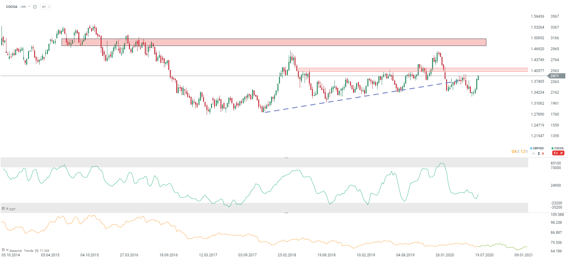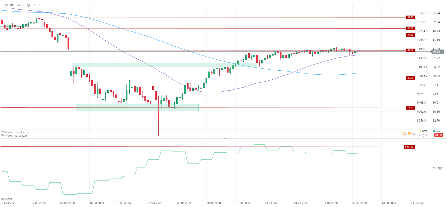 El precio cotiza dentro de la zona de consolidación, que también cuenta con el respaldo de 50 media móvil(MA). La zona de alrededor de la resistencia durante la brecha bajista con origen en la caída de Marzo marca el límite a tener en cuenta. El petróleo está bastante sobrecomprado por los especuladores. Fuente:xStation5