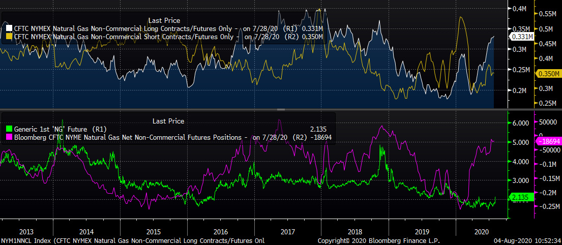 El posicionamiento en el gas es extremadamente alto, aunque se puede ver que tenemos más vendedores netos que compradores. Fuente: Bloomberg.