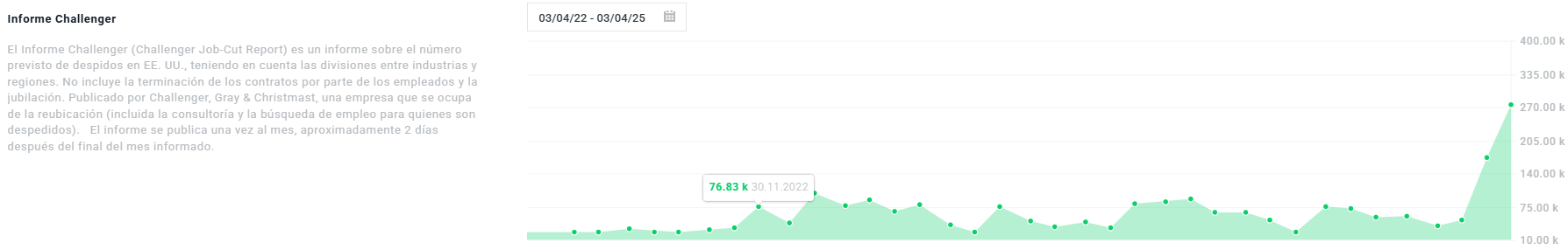 En marzo, los empleadores estadounidenses anunciaron un aumento significativo en los despidos planificados —más de un 60 % por encima de febrero— alcanzando 275.240, la cifra más alta desde el inicio de la pandemia. Según Challenger, el número total de despidos en el primer trimestre llegó a 497.052, el nivel más elevado desde el primer trimestre de 2009. Más de 280.000 de esos despidos estuvieron relacionados con empleados federales y contratistas asociados, principalmente debido a planes vinculados a DOGE. De no haber sido por ello, el mes habría sido relativamente tranquilo en cuanto a despidos.