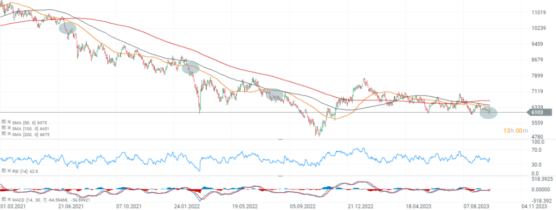 Los futuros de índice chino de referencia (en intervalo D1) están perdiendo más del 2%: el precio no logró superar el promedio SMA50 (línea naranja) el viernes y actualmente cotiza por debajo de otras dos medias SMA200 (línea roja) y SMA100 (línea negra). Históricamente, cuando estaba por debajo de los tres, el lado de la oferta era definitivamente dominante, y es posible que esta vez también estemos viendo el comienzo de una debilidad más amplia. El indicador RSI se ha enfriado hasta los 42 puntos, pero aún está lejos de estar sobrevendido. El repunte del viernes resultó insostenible, a pesar de las entradas récord de capital extranjero a China en siete semanas (alrededor de 1.000 $ millones).