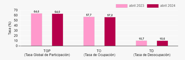 - Tasa Global de Participación: La tasa global de participación se ubicó en 64.0% en abril de 2024, una leve baja respecto al 64.6% del mismo mes del año anterior.