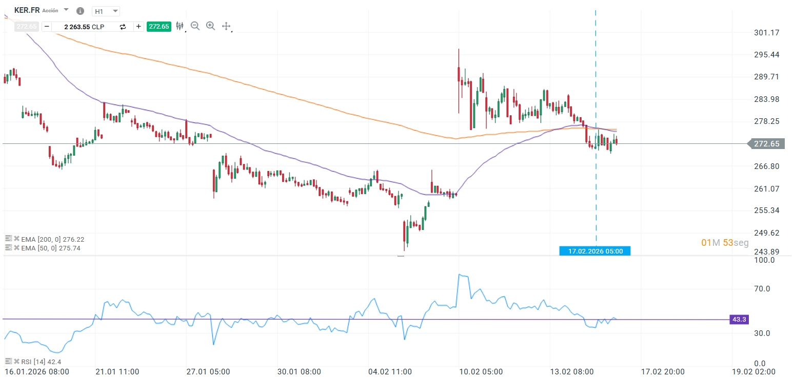 Por su parte, Kering (KER.FR) exhibe un deterioro más pronunciado en su desempeño semanal, acumulando una caída del 4,57%. El precio actual , situado en torno a los 272,65, se encuentra bajo la presión de una resistencia dinámica formada por la EMA de 200 periodos (276,22) y la EMA de 50 (275,74). Al igual que en el caso de Hermès, la proximidad de estos indicadores dificulta el establecimiento de una tendencia de corto plazo clara, operando en un entorno de alta indecisión. El RSI, posicionado en los 42,4 puntos, ratifica un sesgo moderadamente bajista sin alcanzar condiciones extremas, lo que indica que el mercado aún procesa la falta de impulsores positivos para el sector antes de definir un nuevo movimiento.