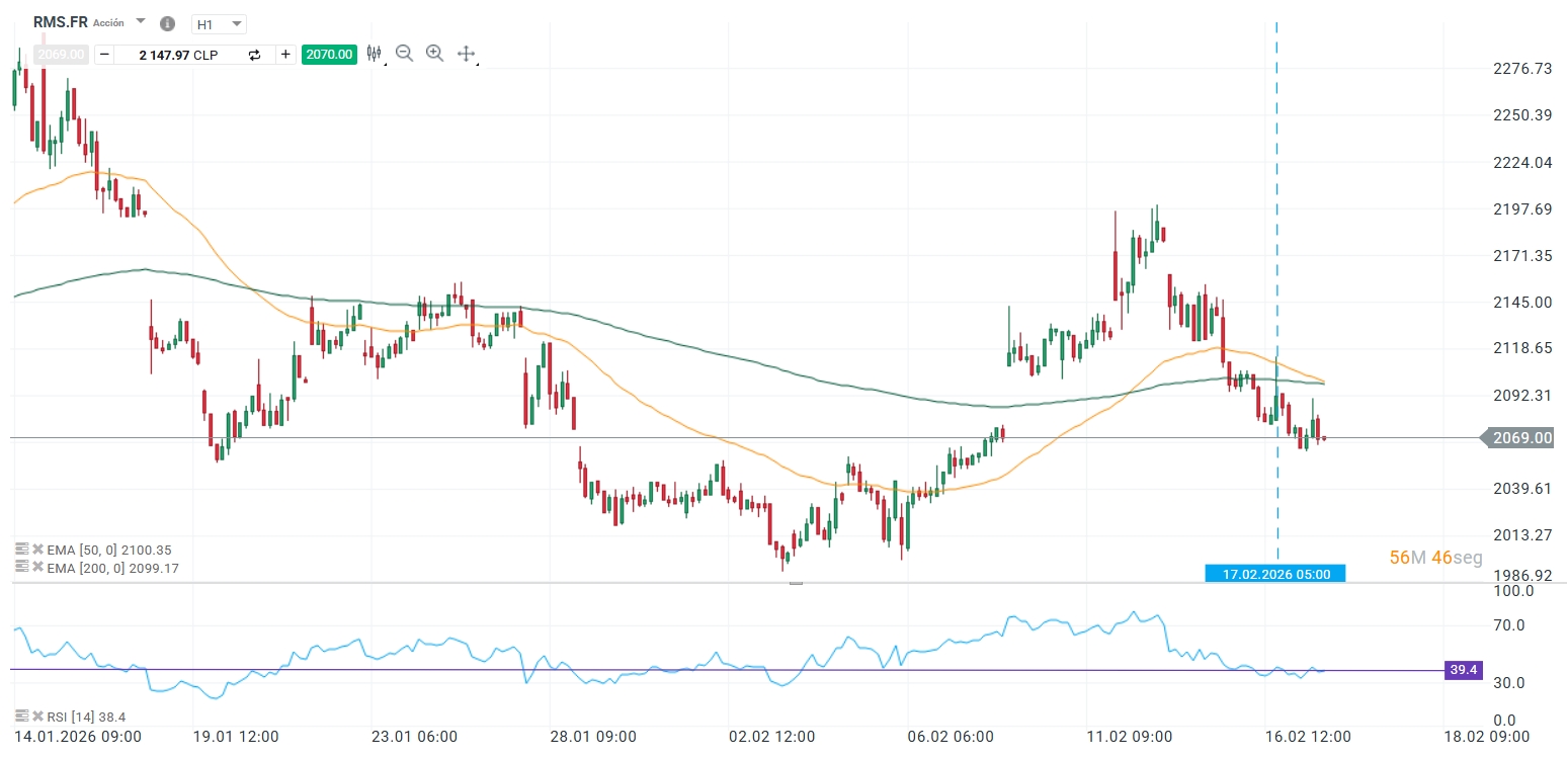 Hermès (RMS.FR) fluctúa actualmente con un impulso debilitado, registrando un retorno negativo del 2,96% durante la última semana. La acción muestra una falta de definición tendencial debido a la convergencia crítica de sus promedios móviles, con la EMA de 50 periodos situándose en los 2.100,35 y la EMA de 200 apenas por debajo, en los 2.099,17. Este estrechamiento extremo de las medias móviles, sumado a un RSI de 38,4 puntos, sugiere que, aunque la presión vendedora predomina, el activo aún no ha ingresado en niveles de sobreventa, manteniendo el precio en una zona de equilibrio frágil cerca de los 2.069.
