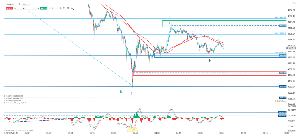 Los metales han mantenido una estructura correctiva en las últimas sesiones. Durante la jornada anterior, la zona de 1.605 actuó como una resistencia relevante, impulsando al precio hacia la región de soporte en torno a los 4.355 puntos. Actualmente, se observa un intento de giro alcista, aunque este movimiento ha encontrado resistencia en la media móvil de largo plazo, lo que mantiene la atención en el comportamiento del precio en torno al punto pivote.