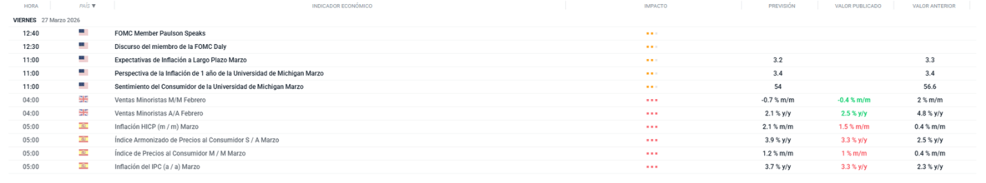 Para la sesión de hoy, la atención de los inversionistas estará centrada tanto en los desarrollos geopolíticos como en la publicación de indicadores económicos relevantes. Entre estos destacan el IPC preliminar de marzo en España, el dato final del sentimiento del consumidor de la Universidad de Michigan para el mismo mes, y las expectativas de inflación del Banco Central Europeo, todos ellos claves para evaluar la trayectoria de la inflación y las decisiones de política monetaria en el corto plazo.