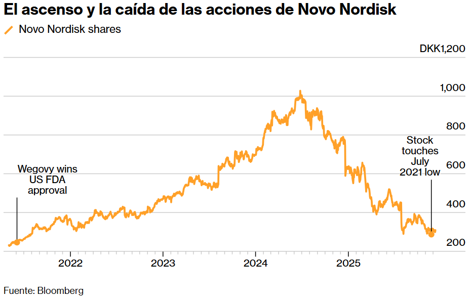 Las acciones de Novo Nordisk han perdido más de la mitad de su valor en 2025, volviendo a niveles previos al boom de Wegovy y encaminándose a su peor año histórico, pese a haber sido la empresa más valiosa de Europa al inicio del año.