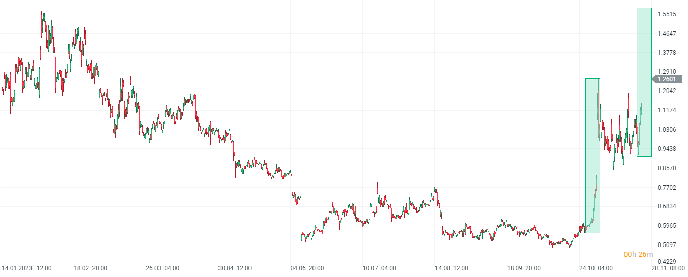 Las alzas de Suchi se han desacelerado hasta el nivel de 1,26 dólares, que coincide con el máximo local anterior, de noviembre. Si los alcistas logran superar este nivel, un posible rango de ruptura podría rondar los 1,57 dólares, lo que pondría a prueba simultáneamente la proximidad de los máximos anuales de 1,60 dólares, a partir de enero/febrero de 2023.