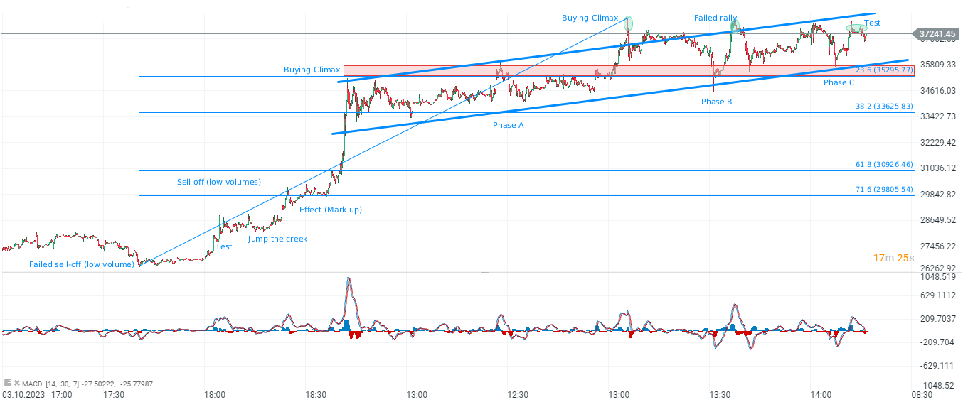 Si observamos el precio del propio Bitcoin, en el intervalo M30, vemos que la mayor de las criptomonedas se encuentra ahora potencialmente en un patrón de distribución Wyckoff bajista. La oferta se ha disparado tres veces después de repuntes fallidos hasta los 38.000 dólares, frenando el repunte de gran volumen, y potencialmente. Una zona clave para detener eventualmente la presión a la baja puede ser $35,000, donde vemos el retroceso de Fibonacci de 23,6 de la onda ascendente de octubre, y potencialmente una ubicación clave para toda la distribución de Wyckoff. Una caída por debajo de este nivel podría presagiar una liquidación y desencadenar la liquidación de posiciones largas. Por otro lado, un repunte por encima de los 38.000 dólares puede indicar que la distribución falló y abrió paso a una resistencia psicológicamente importante de los 40.000 dólares.