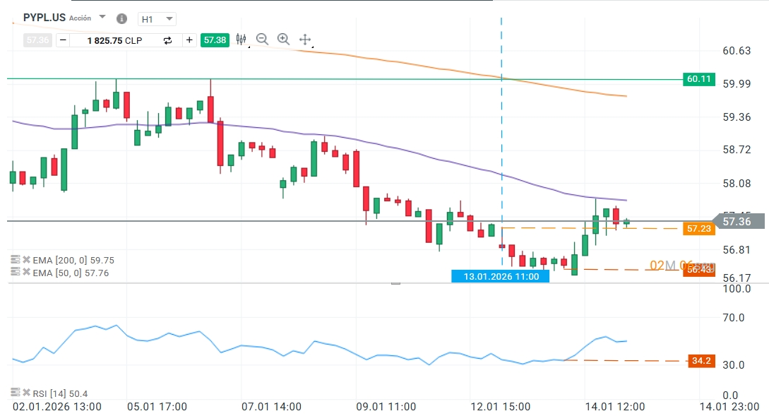 Tras el anuncio público del 13 de enero de 2026 sobre la ronda de financiación de Klearly, la acción de PayPal Holdings (PYPL) mostró una reacción acotada y consistente con el contexto técnico que ya venía dominando. En esa ventana, el precio cedió desde la zona de US$ 57,2 hacia el área de US$ 56,4, lo que refleja presión vendedora de corto plazo más que una validación inmediata del hito corporativo(-1,39%).