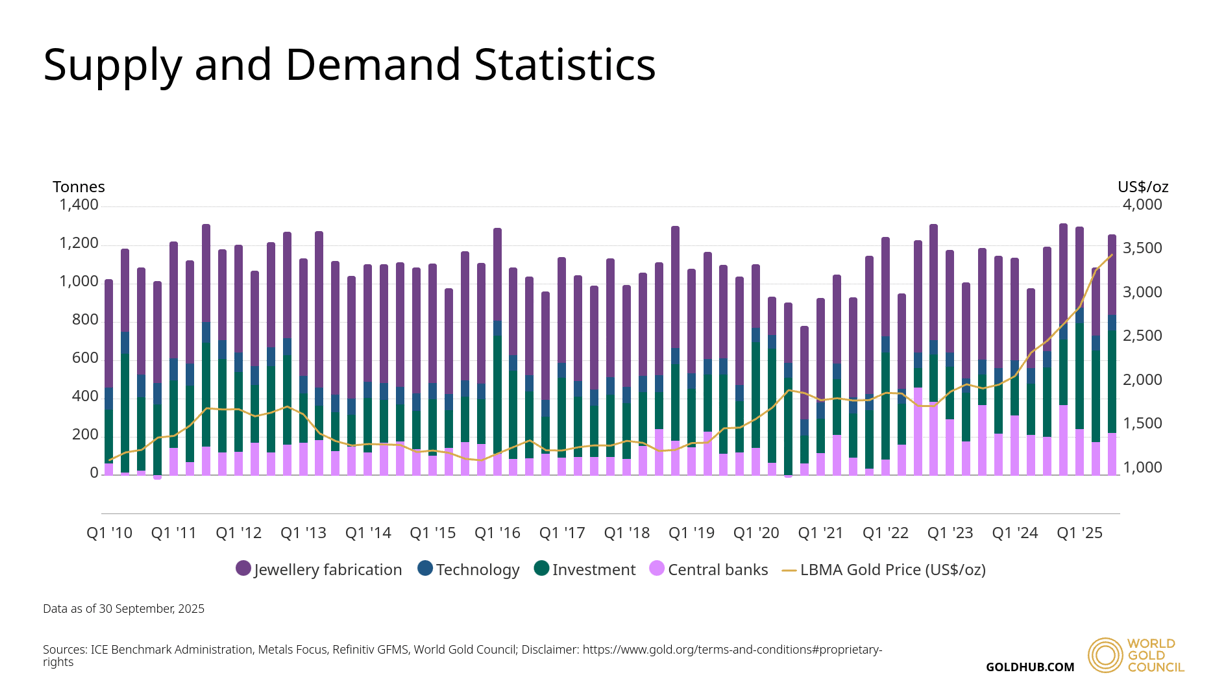 Por el lado de la oferta, la industria respondió a los precios altos. En 2024, la producción minera y el reciclaje aumentaron, llevando la oferta total a 4.974 toneladas, el mayor nivel de la serie del WGC (World Gold Council).