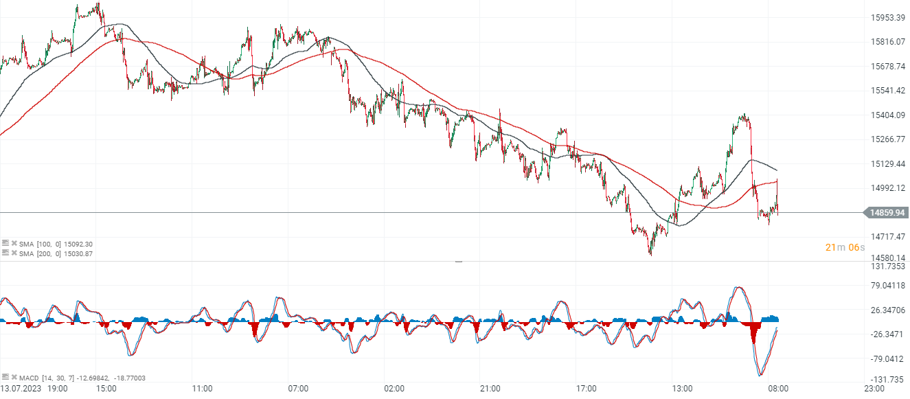 En el Nasdaq, vemos subidas en la reacción inicial, seguidas de una retirada del índice al nivel anterior al discurso. Actualmente, el índice continúa su declive, y si persiste la presión a la baja, no se descarta una nueva prueba de la resistencia en 14,600 puntos, el último mínimo local.