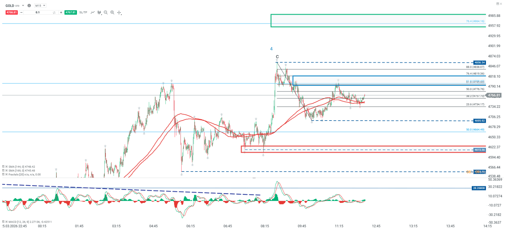 Mientras el precio se mantenga por debajo de este rango, podría prevalecer un sesgo bajista con posibilidad de extender las caídas hacia el soporte relevante en torno a los 4.615. No obstante, una eventual ruptura al alza de esta zona abriría espacio para una reanudación del impulso alcista observado en las últimas semanas, en la resistencia ubicada cerca de los 4.964, correspondiente al retroceso de Fibonacci del 76,4% de la caída previa.