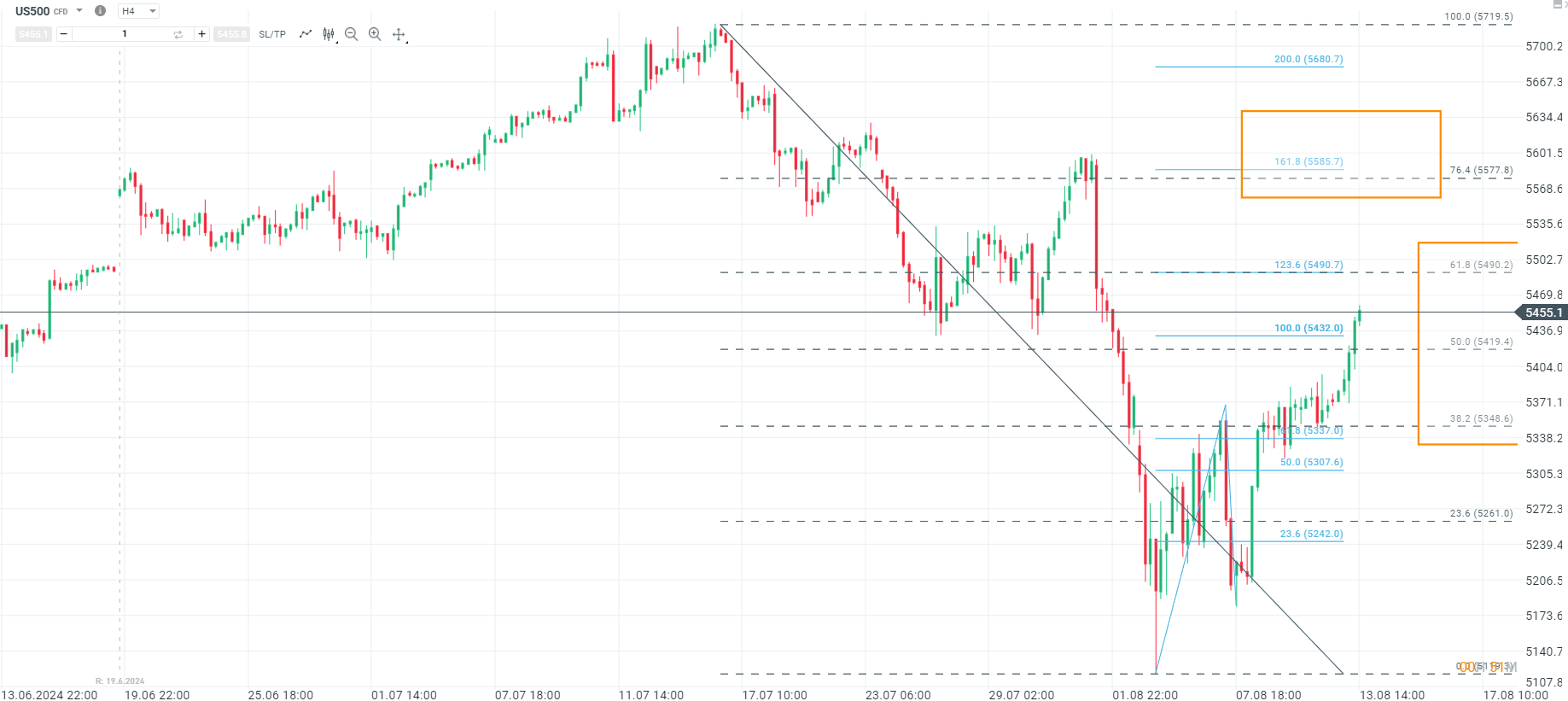 Sin embargo, el Nasdaq ha mostrado señales de un cambio de tendencia. Hoy, el índice rompió al alza un nivel clave que ayer parecía difícil de superar, situándose actualmente en 5455 puntos. Este movimiento indica que ha sobrepasado ligeramente el retroceso del 50% de Fibonacci, y si mantiene este nivel tras la publicación del dato de inflación de mañana, el precio podría dirigirse hacia los 5585 puntos. Este es un punto crucial, ya que podría marcar el inicio de una nueva tendencia alcista, con potencial de llevar al S&P 500 a nuevos máximos históricos en el corto plazo.