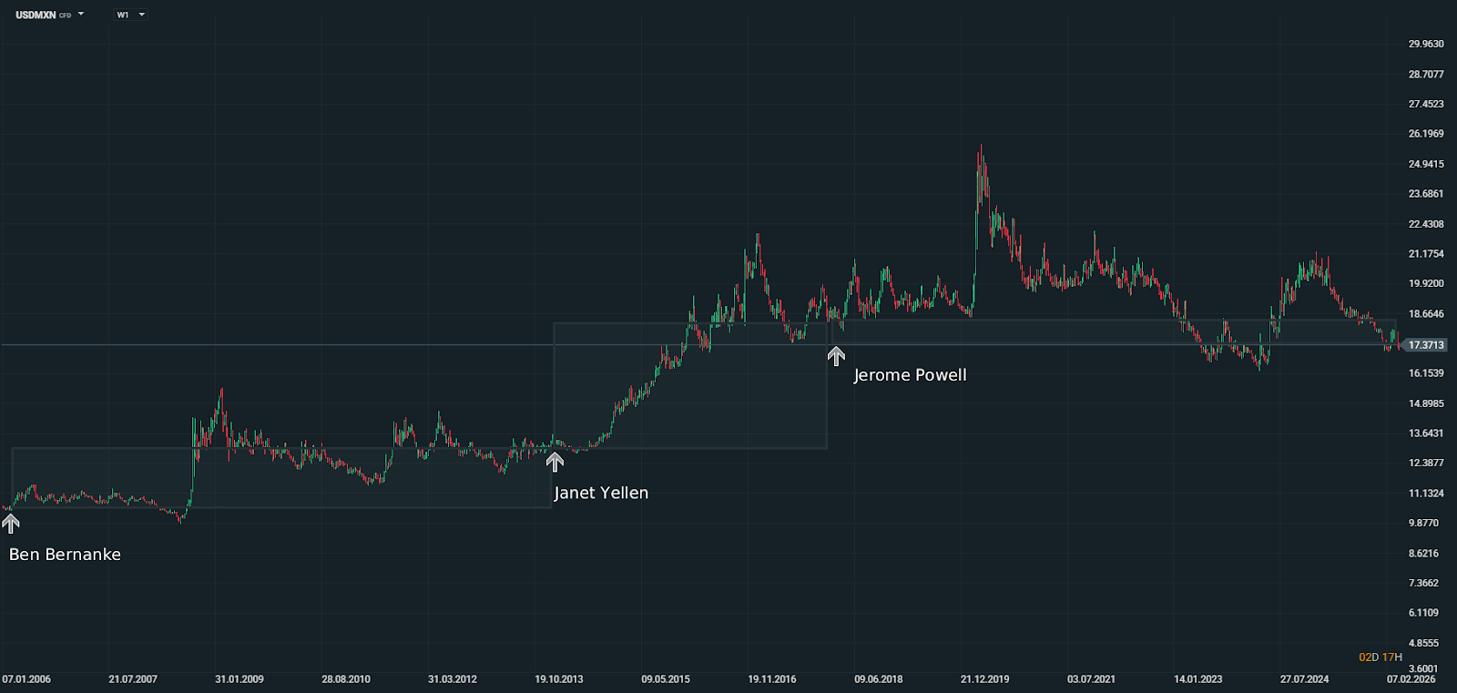 - Las transiciones en la Fed suelen coincidir con debilidad del peso, aunque el contexto actual rompe parcialmente ese patrón gracias al diferencial de tasas y el carry trade.