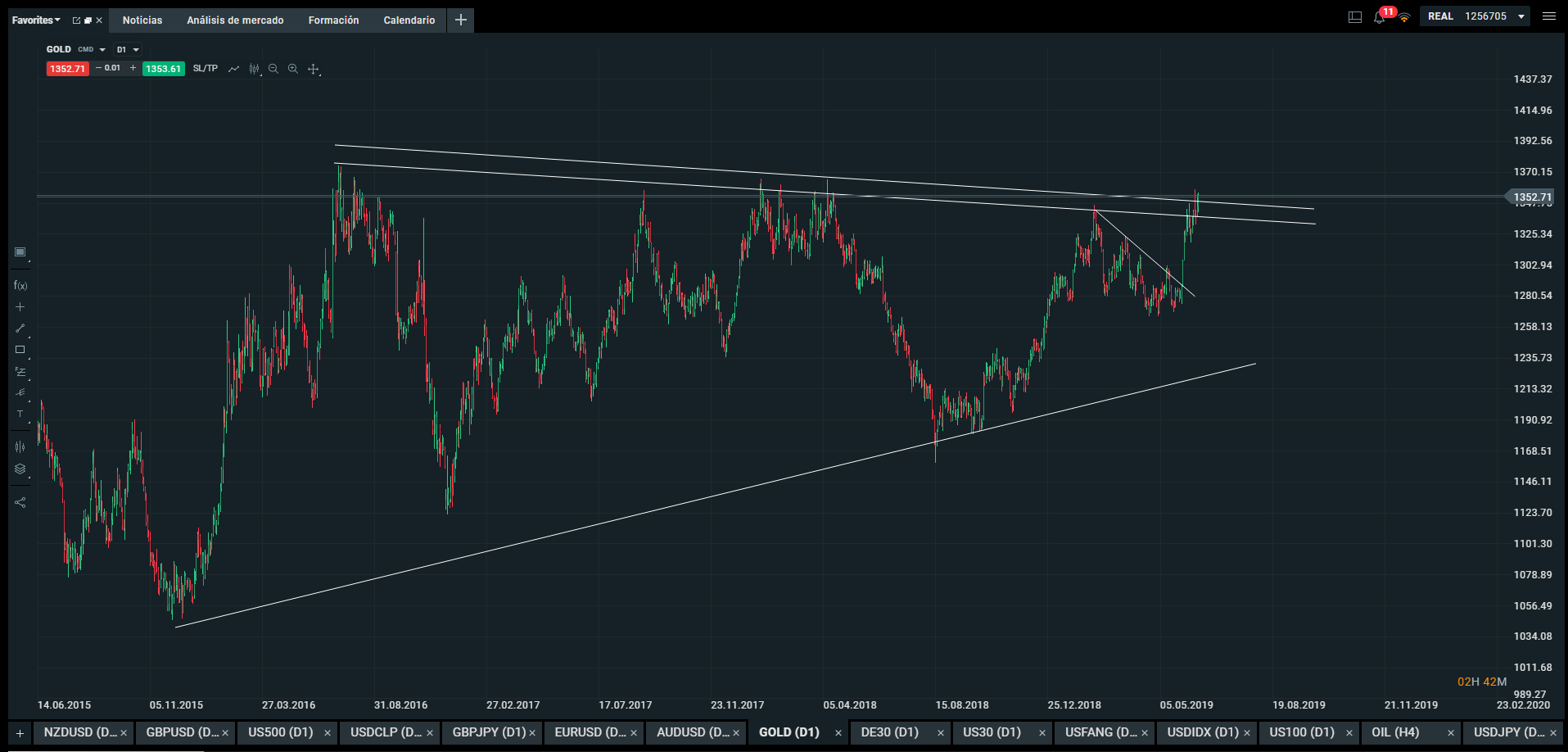 Actuando como activo refugio, el oro cada vez mas intenta atacar la directriz bajista que trae desde el 2016. Para abrir posiciones de venta habría que estar atento a señales de debilidad que pueda mostrar el metal precioso, de los cuales no se refleja ninguna.