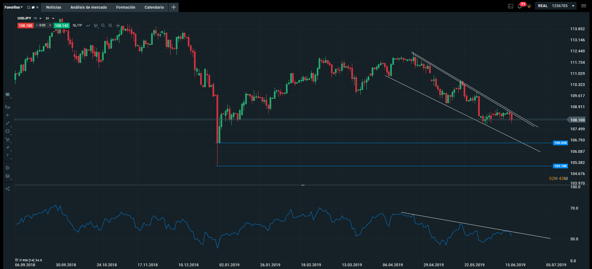 Se aprecia un canal bajista respetando la directriz en RSI también. La señal dovish de la FED respecto a su política monetaria abre mas razones para ir en contra del dolar.
