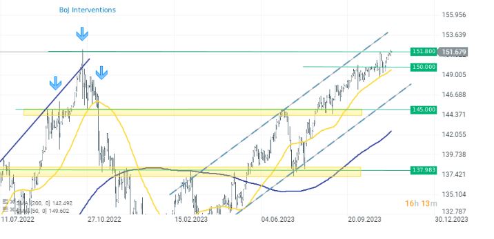 Yen japonés: Hoy cotiza plano, consolidándose alrededor de máximos recientes antes de la intervención a finales de 2022. Sin embargo, se observa que tales niveles ya no provocan una reacción decisiva ni del gobierno ni de los inversores. Fuente: xStation5
