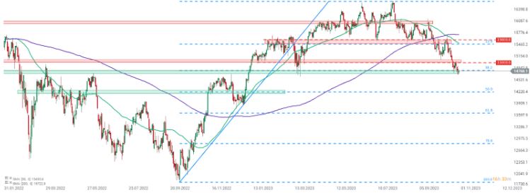 El DAX alemán cotiza un 0,5% arriba al comienzo de una nueva semana. Los alcistas intentan evitar que el índice caiga por debajo de la zona de soporte marcada con un retroceso del 38,2% (área de 14.800 pts).