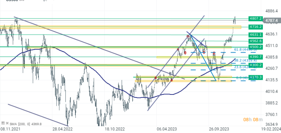 El S&P500 experimentó fuertes subidas la semana pasada. Tras una breve consolidación alrededor del nivel de 4.600 puntos, rompió hasta los 4.800, acercándose a máximos históricos. Ayer observamos una corrección, pero hoy los alcistas están tratando de compensar la caída de ayer. El nivel de 4.700 puntos merece atención como primer soporte y, además, probarlo permitiría cerrar la brecha alcista que apareció hace una semana.
