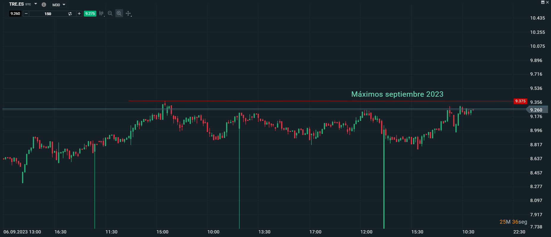 Mientras el Ibex 35 retrocede un 0,30% en la sesión, Técnicas Reunidas se mantiene en verde y en búsqueda de los máximos de septiembre, sumando un 2,26%.