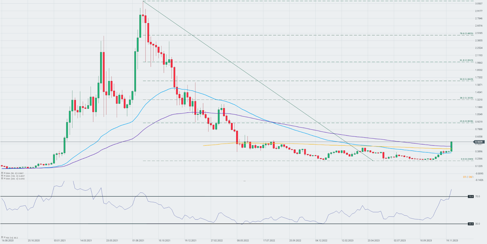 Hoy, Cardano sube más del 23% y es una de las altcoins con mejor rendimiento de la lista de las 50 principales. La criptomoneda superó la convergencia de los promedios móviles exponenciales de 50, 100 y 200 semanas por primera vez desde 2021.