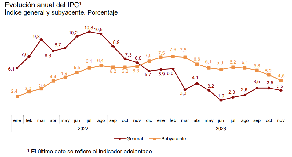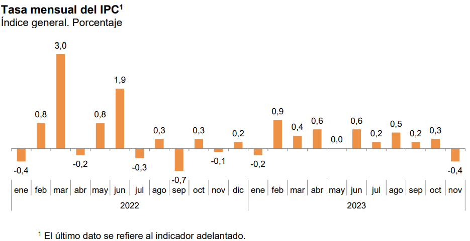 La lectura preliminar del IPC español de noviembre acaba de publicarse. Se esperaba que el informe mostrara una aceleración del 3,5 al 3,7% interanual. El informe real mostró una desaceleración inesperada del 3,7 al 3,2% interanual. Mensualmente, la inflación del IPC fue del -0,4% intermensual, mientras que el mercado esperaba un +0,1% intermensual.