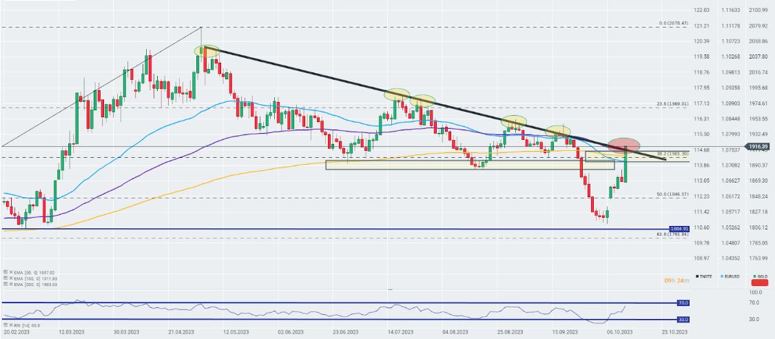 El oro está encadenando subidas y en este momento el lingote está ganando más del 2,66% intradía. Es más, el oro superó hoy la barrera psicológica de los 1.900 dólares la onza y ahora está probando el límite superior del canal de tendencia bajista a medio plazo marcado en el gráfico siguiente.