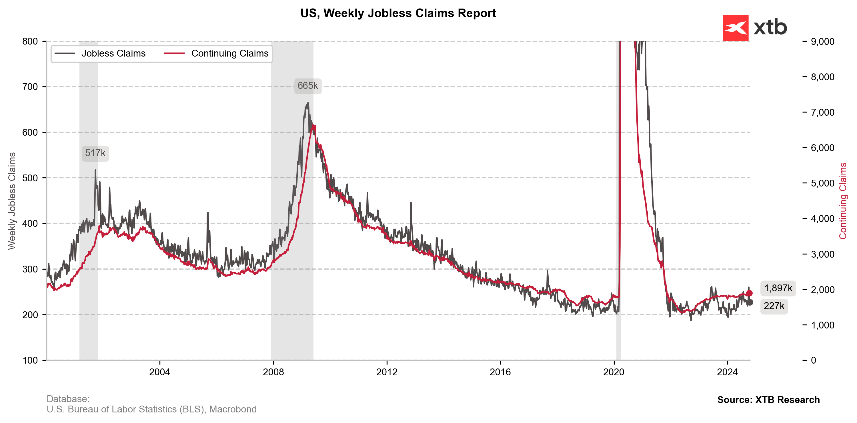 Las solicitudes de subsidio por desempleo en EE. UU. fueron de 227 000 frente a las 242 000 esperadas y las 241 000 anteriores, cifra revisada a 242 000