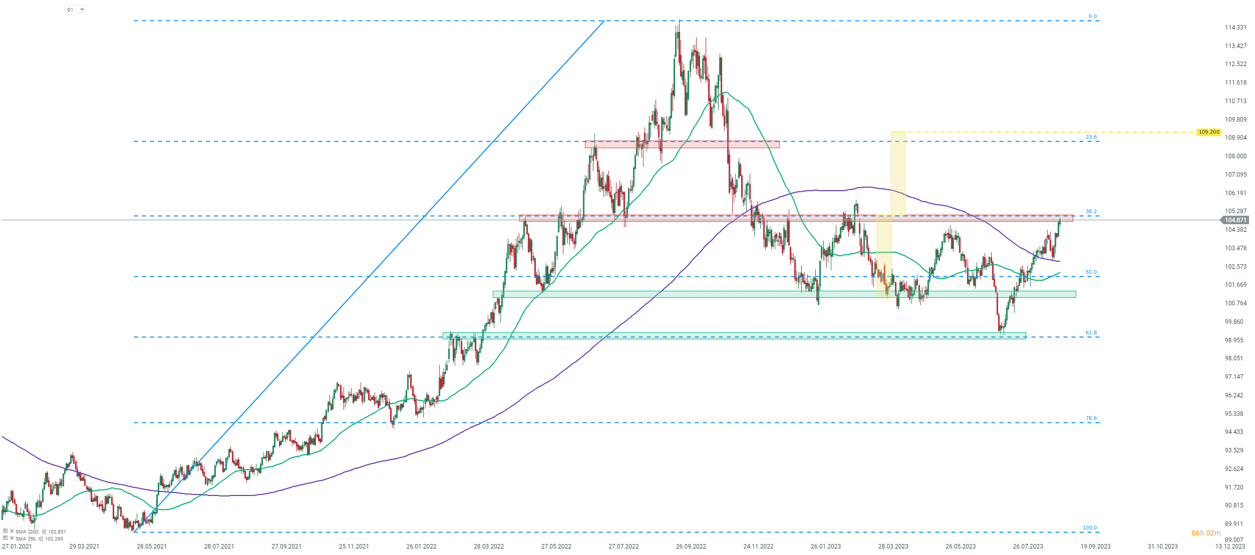 Al observar el índice del dólar estadounidense en el intervalo D1, podemos ver que el índice ha subido a la zona de resistencia a medio plazo que se encuentra debajo del retroceso del 38.2% del movimiento a la baja iniciado a mediados de 2021 (área de 105.00). El índice está operando al nivel más alto en medio año y si vemos una ruptura por encima del mencionado área de 105.00, que también actúa como el límite superior del rango de negociación, podríamos ver un movimiento al alza más grande. El rango de libro de texto de la ruptura de este rango sugiere la posibilidad de que el índice se mueva hasta el área de 109.20.