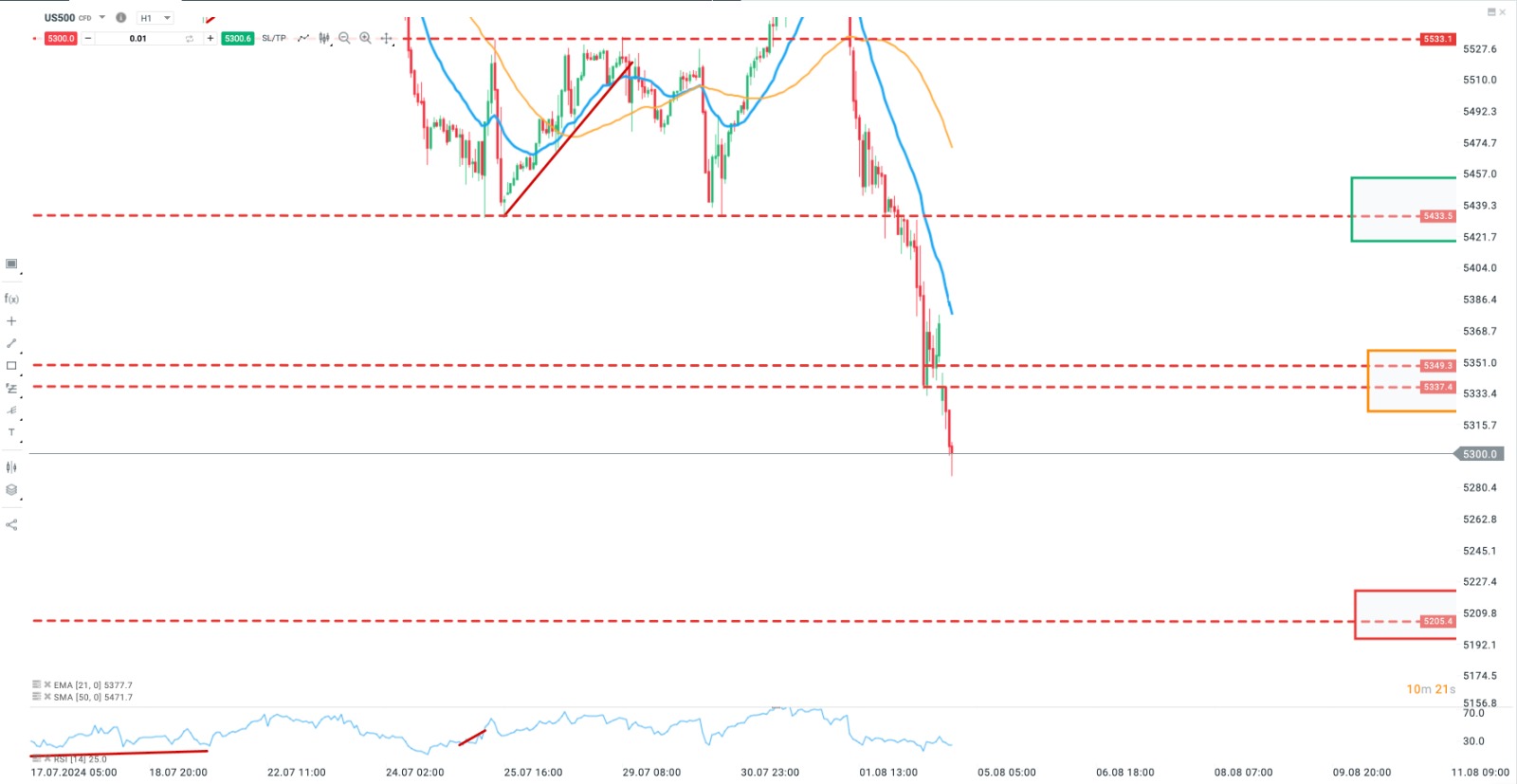 Mercado bajista continuando con la estructura bajista observada el viernes, donde el precio ha perdido el nivel de soporte de los 5337, situándose por debajo de las medias móviles. Este nivel, sin embargo, sigue siendo de relevancia.