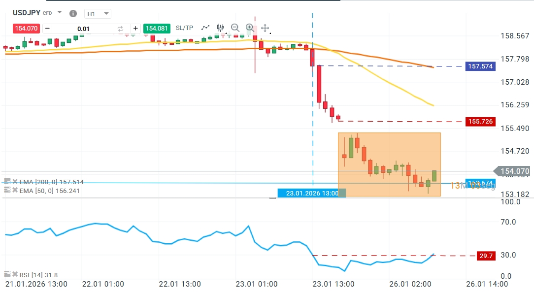 Actualmente, el par negocia en la zona de los 154,00, consolidando un sesgo bajista confirmado por la disposición de sus promedios móviles, con la EMA de 50 (amarilla) y la EMA de 200 (naranja) situándose por encima del precio. Esta debilidad se ve reflejada en el RSI, el cual se encuentra en los 29,7 puntos. La cifra indica una condición de sobreventa en el sentimiento del mercado, correlacionada con la fuerza de la reciente capitulación tras la jornada del 23 de enero.