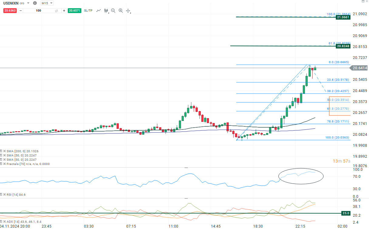 El USD-MXN muestra una fuerte tendencia alcista impulsada por el cruce de medias móviles y la expansión del ADX, que indica un aumento en la fuerza de la tendencia. El RSI se encuentra en niveles de sobrecompra, lo cual sugiere una posible corrección en el corto plazo. Si el par mantiene su impulso y rompe el nivel de 20.66, el próximo objetivo estaría en 20.82 (nivel de Fibonacci 61.8%) y luego en 21.06 (extensión de Fibonacci 100%). Una corrección podría llevar al USD-MXN hacia el soporte en 20.51 (Fibonacci 23.6%) y, de romper este nivel, podría buscar el área de 20.42 y 20.35, coincidiendo con los niveles de Fibonacci 38.2% y 50%, respectivamente.